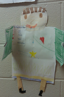 Parts, which they loved, and talked about our body parts. We then made "mini me's" complete with a shirt that opens like a book where we included our map keys. The children identified their eyes, nose, mouth, heart and belly button by using different symbols and then created a map key for people to read their maps. They did a great job on this! There are a couple of pictures of them below.